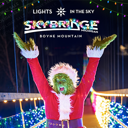 Don’t miss SkyBridge Michigan’s new Lights In The Sky experience, featuring over 150,000 twinkle lights. This captivating display transports you to a world of wonder and awe. Join us for an enchanting night under the stars and be part of the luminous holiday magic at Boyne Mountain.